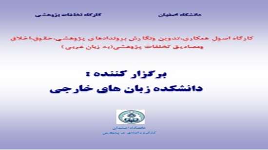 به اطلاع می رساند دانشکده زبان های خارجی دانشگاه اصفهان کارگاه آموزشی با عنوان « اصول همکاری، تدوین و نگارش بروندادهای پژوهشی، حقوق، اخلاق و مصادیق تخلفات پژوهشی» ویژه دانشجویان تحصیلات تکمیلی (ارشد و دکتری) جهت دانشجویان ورودی 1404 و نیز دانشجویان ورودی ماقبل که موفق به گذراندن کارگاه نشده اند، برگزار مینماید.